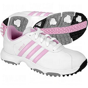 adidas Golf Junior's K Gazelle Golf Shoe (White/White/Blossom): Made using adidas Sport Last that combines the stability of a golf last with the comfort of a sport last, this Junior's K Gazelle Golf Shoe features an anatomically correct forefoot shape and additional room in front to promote exceptional walking comfort for players. Features: Non-waterproof Suede uppers with a retro look and feel Die-cut EVA insole for lightweight comfort Injection-molded EVA midsole reduces midsole weight Advanced Traxion technology permanent spikes provide grip and versatility Durable adiWEAR rubber outsole Clog resistant cleats